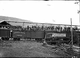 During the years 1907 to 1909, Frank photographed the extent of Vancouver Island. In the summer of 1909 he operated a gasoline launch on Great Central Lake, for the transport of touring parties.[12] His reputation was now spreading to international locales. Besides Vienna, he had exhibits in London and Glasgow, and his logging photographs were singled out for praise. He started to win contracts from timber and mining companies, beginning his career as an industrial photographer.[9] In 1910, Frank published a book of Alberni views.[13] He was usually present to record any local historical event, such as the arrival of the first passenger train of the E&N Railway to arrive in Port Alberni in 1911.[14] The following year he was assigned as the official photographer of the newly created Strathcona Provincial Park.