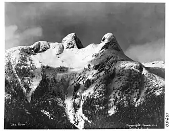 In the fall of 1918, Frank travelled to Haida Gwaii to photograph stands of Sitka Spruce used in airplane manufacture.[22] In 1919, he captured The Lions, a pair of peaks north of Vancouver. Perhaps his most celebrated image, the photograph was immediately successful, and appeared in the local papers as well as Leslie's Weekly.[23]