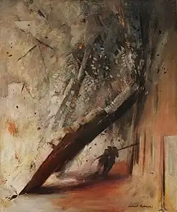 At the beginning of the Second World War Rosoman joined the Auxiliary Fire Service, which in 1941 became the National Fire Service, and began making paintings based on his experiences as a fire-fighter during the Battle of Britain and the Blitz in London.[2] One of these, A House Collapsing on Two Firemen, Shoe Lane, London, EC4 (1941), now in the Imperial War Museum,[4] shows the incident on the night of 29/30 December 1940[5] in which a young fireman who had just relieved Rosoman at his position was killed by a collapsing building in the City of London.[6] Whilst the other fireman, the author William Sansom, survived, the scene haunted Rosoman and he re-worked the painting several times.[7] Rosoman sometimes called his work, The Falling Wall.[5][8] It was completed in August 1941.[9] The painting was shown in the Firemen Artists exhibition at the Royal Academy in 1941.[4]