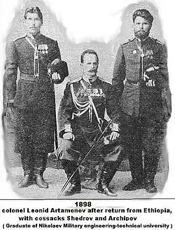 In 1897, he was a member of the Russian diplomatic mission to Ethiopia, where he became a military adviser of Negus Menelik II.[2] During 1897–1898, he became a military aide of Menelik during his efforts to modernise the Ethiopian military, which included hiring European experts to provide training to the Ethiopian army. Artamonov was one of a contingent of Russian officer volunteers attached to the forces of Ras Tessema, and joined the expedition of the Ethiopian army to the White Nile and provided assistance during their conflicts with Sudanese forces. He was eventually discharged and returned to Russia, where he enlisted in the Russian Army around the outbreak of the First World War.[2]