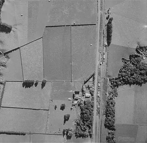 The original railway station was opened on 30 November 1877,[1] approximately 2.5 km (1 mile 45 chain) south of Sentry Hill, then the junction between the Waitara–New Plymouth Railway and the new southern line to Inglewood. The station was located close to the intersection of Mountain and Manutahi Roads. Facilities included a shelter shed and passenger platform, a loading bank for goods and a loop big enough to hold 26 wagons.