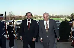 Aspin served as an adviser to Clinton on defense matters during the 1992 presidential campaign.[17] Given Clinton's lack of military experience, appointment of a prominent and respected defense expert to head The Pentagon seemed desirable. Because of his leadership position in the House, Aspin's views on defense issues were well known. He was skeptical about the Strategic Defense Initiative, and favored a smaller Navy, a cut in U.S. troops in Europe, and further reduction of military personnel strength. These positions, along with the assumption that Aspin would work toward a substantial cut in the Defense budget, worried the military. Defense industry leaders applauded Aspin's selection because he favored maintaining a viable defense industrial base. Although questioned extensively, Aspin won easy confirmation in the Senate.[18][19]