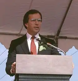 In September, Packwood pulled ads that had falsely criticized AuCoin for missing votes while speaking to special interest groups.[104] By October, Packwood had raised $8 million,[105] spending $5.4 million more than AuCoin, and leading all Senate incumbents.[106] Yet that fall, the two candidates were in a dead heat, with Packwood continuing to criticize AuCoin on attendance, his House bank account and the spotted owl, and AuCoin echoing the campaign of popular presidential candidate Bill Clinton by accusing Packwood of favoring the wealthy over the middle class.[107]