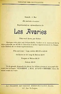 Les Avariés was staged at Montreal's Théâtre des Nouveautés in 1905, with the theatre taking the unusual measure of admitting only men. A critical notice in the newspaper Le Nationaliste declined to describe the play's subject matter, but offered the opinion that the play "despite the poor reputation which preceded it in Canada... posed not the slightest danger to a male audience"[a].[10]