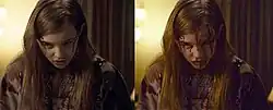 Houdini software was used for much of the film's shots which involved Abby in her vampiric form. Faden noted the techniques used in another challenging shot important to Abby's character in which she begins bleeding when she enters Owen's apartment without invitation. Faden stated, "Normally in such a scene, the character would be shot on set, dressed in blood. But in this case, the timing of the bleeding was so dependent on the emotional beats of the scene that this technique wouldn't have allowed us enough control."[39] Actress Chloë Grace Moretz was first shot with minimal prosthetic blood applied to her face for reference. Then using techniques utilized in a prior Method Studios film, A Nightmare on Elm Street, Faden had the Houdini software track Moretz's shaking movements and render the gradual release of blood from her face.[40]