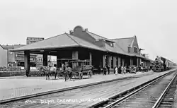 An official dedication ceremony was held on January 23, 1913. Hosted by William West, a banquet crowd of 200 people were joined by several prominent railroad officials.[13][53] The structure was immediately of use to other rail companies.[16] By 1914, the station and rail tracks accommodated a weekly average of 17 freight and 44 passenger trains.[13] An early taxi service by buggy led from the depot to the Hotel Savoy, known previously as the Tynan Opera House built and owned by Eliza Barrett.[54]