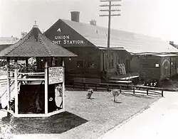 Due to injury concerns, the city attorney in February 1904 declared the train platform a "menace" and demanded the area be tiled.[25] The issue was addressed the following month; the platform was lowered with a 200 foot (61 metres) extension on the south end of the site.[26] The project was expanded to include an enlargement of the building by 50 feet (15.2 m) on the south end, which included a larger baggage area. Additionally, the floors were lowered, as were all doors and windows, and a more convenient bay window ticket booth was installed. The known problem on the platform, which caused repeated falls off the raised area and was known simply as "the ditch", was boxed in.[27] A city-wide paving of streets project begun in late 1907 led to the installation of cement sidewalks at the depot.[28]