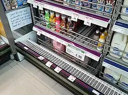 This shortage prompted local supermarkets and retailers to take extreme measures to secure stock and ensure fair purchasing. In some cases, rationing was implemented so as to limit the purchase to two bottles per person, and security guards were hired to monitor shoppers and fridges containing chocolate milk.[10][11] The shortage also resulted in the emergence of chocolate milk black markets, ranging from scalpers attempting to resell bottles on TradeMe at three to four times their original price to counterfeit chocolate milk production.[12]