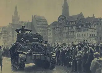 The liberation of Strasbourg took place on 23 November 1944 during the Alsace campaign (November 1944 – March 1945) in the last months of World War II. After the liberation of Mulhouse on 21 November 1944 by the 1st Armored Division,[1] General Philippe Leclerc de Hauteclocque and the 2nd Armored Division entered the city of Strasbourg in France after having liberated Sarrebourg and La Petite-Pierre from Nazi Germany, clearing the way for the advance on Strasbourg.