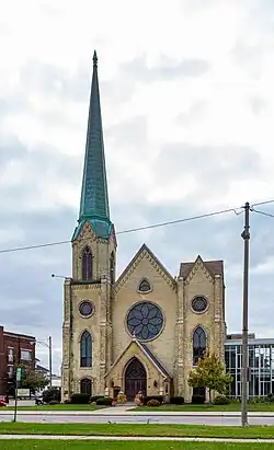 Two prominent ecclesiastical buildings were constructed in the 1870s: the First Congregational Church in 1874[9] and St. Matthew's Episcopal Church in 1879.[10] The Queen Anne style dominated 1890s development. Examples include the Nathan R. Allen, Jr. House[11] and the Urban J. Lewis House.[12] The Gilbert M. Simmons Memorial Library, designed by Daniel Burnham, opened to the public in 1900. It was built in the center of City Park, which was subsequently referred to as Library Park.[6]