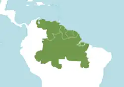 It is found[3] in the forests and hills of Brazil, Venezuela,and the Guianas. An area characterized by a warm humid climate with many rivers.