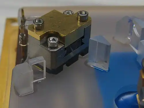 Photograph shows the technique used to mount optics in a Lightwave Electronics single-frequency frequency-doubled laser. The optic in the left foreground is bonded with a thin layer of UV-curing adhesive to a support block, also made of glass, which is bonded to the platform. This design approach allows 5 degrees of freedom for the optic, with a thin adhesive bond.[23]