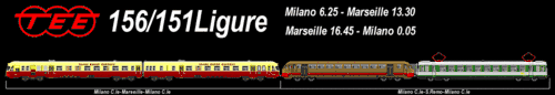 The Ligure was planned to be one of the initial TEE services at the start of the network at 2 June 1957. However the rolling stock was late itself and the service couldn't start before 12 August 1957.[2] Initially the service linked Milan with Marseille calling at several cities, as Genoa, Monaco and Nice and tourist resorts along the Mediterranean coast. The Aln 442-448 diesel multiple units attracted more and more passengers over the years and by 1966 the train was coupled with an Ale-840 on the Italian stretch to cope with the raising number of travellers.[3]