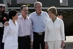 From left to right: First Lady Moreno and President Álvaro Uribe Vélez, together with the President of the United States George W Bush and First Lady of the United States Laura Bush during a visit to Prairie Chapel Ranch in 2005.