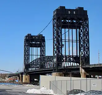 The bridge and its sister, the Lincoln Highway Hackensack River Bridge are important components in the transportation of goods in the Port of New York and New Jersey. Since the nearby Pulaski Skyway prohibits trucks they often use Route 1/9 Truck to serve traffic at Port Newark, Newark Airport, the Holland Tunnel and the numerous intermodal freight transport facilities in the New Jersey Meadowlands. The NJDOT is considering building a new bridge along the alignment of the now defunct PD Draw, the former Newark and New York Branch bridge at mile point 1.2.[13][14][15] Studies are being conducted as part of an extensive project conceived to facilitate freight transshipment through the port known as Portway. A new bridge could include a rail component. The dual bridge combination would allow for two one-way crossings of the Passaic.[16]