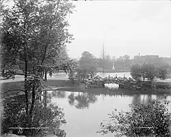 The park, first known as West End Park, was first landscaped in June 1858, after the buried were relocated to a cemetery elsewhere, likely Price Hill Potter's Field. Around 1865, the park was renamed Lincoln Park, after the recently assassinated President Abraham Lincoln.[10] Around 1872, citizens pushed for the addition of 27 acres to Lincoln Park, noting it as an "oasis in the desert of bricks", heavily used by residents in need of parks in walking distance from their homes. In 1873, Cincinnati parks landscape architect Adolph Strauch improved the park, adding its miniature lake, small waterfall, island, and grotto, introducing the park's rare birds, and planting gardens and new trees. These picturesque elements were more common in eighteenth-century English gardens.[11][12]