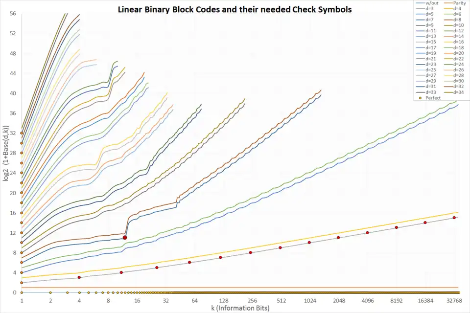 There are theoretical limits (such as the Hamming limit), but another question is which codes can actually constructed. It is like packing spheres in a box in many dimensions. This diagram shows the constructible codes, which are linear and binary. The x axis shows the number of protected symbols k, the y axis the number of needed check symbols n–k. Plotted are the limits for different Hamming distances from 1 (unprotected) to 34. Marked with dots are perfect codes: