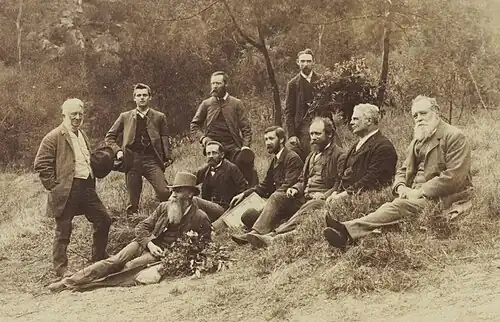 Sitting, from right to left: Sir William Macleay, Dr James Cox, John Brazier, J. H. Maiden, Ernst Betche, Henry Deane.