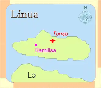 Linua has a length of 2.8 km and diameter of 1 km.[3] The estimated terrain elevation above sea level is 23 meters.[4] Linua lies about 60 miles (100 km) north of Espiritu Santo Island between islands of Tegua and Lo. The island is surrounded by coral reefs. There is an airstrip on the island[5] opened in 1983 that provides the only regular transportation flights with the rest of Vanuatu.