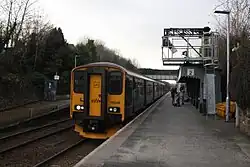 A Class 150 at Liskeard going towards Plymouth. The underslung 'gallows' signal allows drivers to see it clearly behind the waiting shelter
