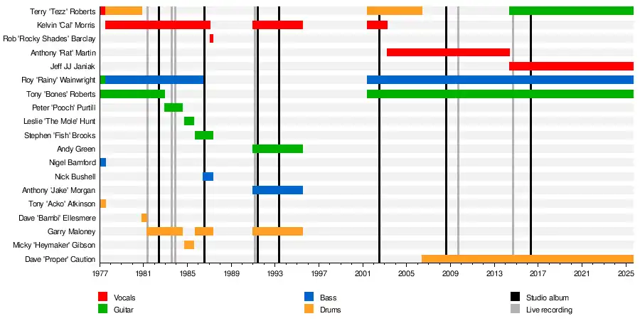 Discharge are an English hardcore punk band from Stoke-on-Trent. Formed in early 1977, the group originally featured a lineup of vocalist Terry "Tezz" Roberts, guitarists Roy "Rainy" Wainwright and Tony "Bones" Roberts, bassist Nigel Bamford and drummer Tony "Acko" Atkinson. The band's current lineup features Rainy on bass (initially as guitarist, a constant member, save for the group's 1991–99 reunion), Bones on guitar (who originally left in 1982 and rejoined in 2001), Tezz on guitar (initially as vocalist, the band's drummer from 1977 to 1980 and 2001 to 2006, before rejoining in 2014), drummer Dave "Proper Caution" Bridgwood (since 2006) and vocalist Jeff "JJ" Janiak (since 2014).