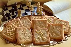 A type of German biscuit with an embossed design made by pressing a mold onto rolled dough and allowing the impression to dry before baking. |