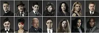 Main and recurring characters of Gothamseason 1. From left to right in the upper row: James Gordon, Harvey Bullock, Bruce Wayne, Selina Kyle, Sarah Essen, Barbara Kean, and Alfred Pennyworth. From left to right in the lower row: Oswald Cobblepot, Fish Mooney, Carmine Falcone, Edward Nygma, Ivy Pepper, Renee Montoya, and Crispus Allen