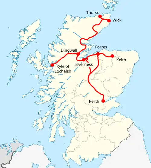 The Highland Railway was one of the smaller British railways before the Railways Act 1921, operating north of Perth railway station in Scotland and serving the farthest north of Britain. Based in Inverness, the company was formed by merger in 1865, absorbing over 249 miles (401 km) of line. It continued to expand, reaching Wick and Thurso in the north and Kyle of Lochalsh in the west, eventually serving the counties of Caithness, Sutherland, Ross & Cromarty, Inverness, Perth, Nairn, Moray and Banff. Southward it connected with the Caledonian Railway at Stanley Junction, north of Perth, and eastward with the Great North of Scotland Railway at Boat of Garten, Elgin, Keith and Portessie.[1]