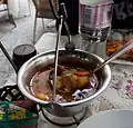 A rich bean soup, with many vegetables, smoked pork hock pieces and noodles. It is often made to be spicy or some sort of hot chili offered with it.