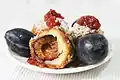 A dish made of stuffed peppers, with a mix of meat and rice in tomato sauce, the ingredients consisting of green or red capsicums, eggs, spices, salt, tomato, minced meat, and rice.