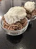 Gesztenyepüré Cooked and mashed sweet chestnuts with sugar and rum, topped with whipped cream.