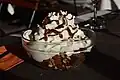 Somlói galuska Budapest/Fót A sponge cake with raisins, walnuts, served with rum, chocolate sauce, and whipped cream.
