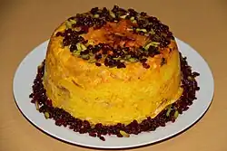 Morasa polow: Rice "jewelled" with barberries, pistachios, raisins, carrots, orange peel, and almonds.[15][16]