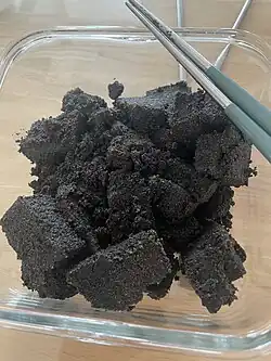Dasik, a variety of hangwa, is made from nongmal (which is starch made from potatoes, sweet potatoes or soaked mung beans), pine pollen singamchae, black sesame, honey, flour from rice or other grains, nuts and/or herbs.[5][6][7] -