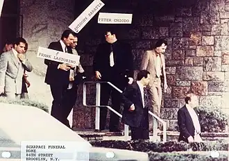 In November 1989, Baratta along with boss Vic Amuso, underboss Anthony Casso, capos Al D'Arco, Sal Avellino, Peter Chiodo, Bobby Amuso and Frank Lastorino inducted Richie Pagliarulo, Mike DeSantis, Frank Federico and two others into the family.[22] In January 1991, boss Vic Amuso and underboss Anthony Casso went into hiding and promoted Al D'Arco to acting boss, Baratta was promoted to acting underboss and Steven Crea to acting consigliere.[19] In 1991, Baratta serving as acting underboss viewed a Genovese family list of proposed new members, he commented to D'Arco, after seeing the name Ralph Desimone "He is a rat.".[23] A sit-down was arranged between the two families. The Genovese family acting boss Liborio Bellomo, acting underboss Michael Generoso and consigliere James Ida attended the meeting to discuss "Ralph Desimone" with Lucchese's acting boss Al D'Arco and Baratta as acting underboss.[23] The Genovese leaders asked Baratta about Desimone he said "Desimone had been a government witness", the Genovese leaders leave saying "will take care of it".[23] On June 13, 1991, Desimone's dead body was found in a trunk of a car at LaGuardia Airport.[23]