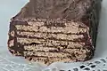 Delfiakake Uncooked flat, square or bar-shaped chocolate snack/dessert, similar to a fudgey chocolate brownie but with alternating lighter and darker areas