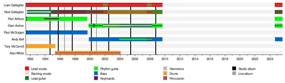 Oasis are an English rock band founded in Manchester in 1991. The band originally included Liam Gallagher (lead vocals), Paul "Bonehead" Arthurs (guitar), Paul "Guigsy" McGuigan (bass guitar) and Tony McCarroll (drums), who were soon joined by Liam's older brother Noel Gallagher (lead guitar, vocals, main songwriter). The band, who reunited in 2024, currently consists of Liam and Noel Gallagher, Arthurs, guitarist Gem Archer and bassist Andy Bell (both of whom first joined in 1999).