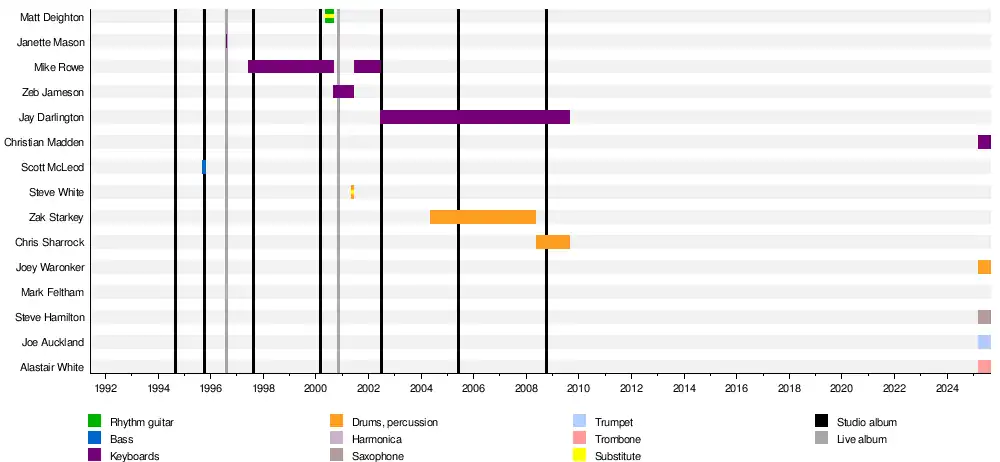 For the band's next tour, Zeb Jameson replaced Rowe as touring keyboardist,[14] although Rowe subsequently returned in 2001. Also in 2001, Alan White's brother Steve briefly replaced him on drums.[15] In 2002, former Kula Shaker organist Jay Darlington joined as new touring keyboardist.[16] In 2004, Alan White was asked to leave the band,[17] his replacement was Zak Starkey (son of Ringo Starr and drummer with The Who) as a session/touring member.[18]