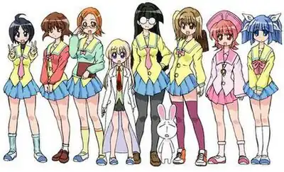 The main characters of Pani Poni (from left to right): Himeko Katagiri, Ichijō, Miyako Uehara, Rebecca Miyamoto, Rei Tachibana, Mesousa, Kurumi Momose, Behoimi, and Sayaka Suzuki (No. 6).