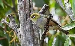 The white-eyes are a large family of mostly Old World passerine birds. They are rather diverse in size and colouration, but are characterised by soft fluffy plumage. These are birds of tropical areas, with the greatest variety in Southeast Asia. One species reaches Tasmania.