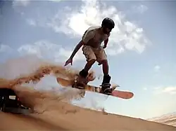 - Sandboarding – comparable to snowboarding, in which participants attempt to traverse across or down a sand dune while standing freely, or strapped onto, a sandboard.[53][54]