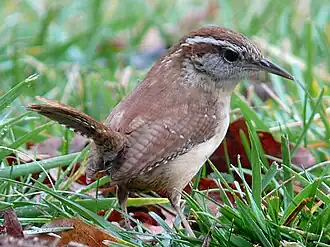 Wrens are small and inconspicuous birds, except for their loud songs. They have short wings and thin down-turned bills. Several species often hold their tails upright. All are insectivorous. Six species have been recorded in South Carolina.