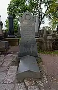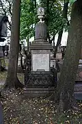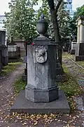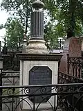 Containing a large number of famous burials and elaborate funerary sculpture from some of the country's leading artists, the cemetery has been called the Necropolis of the XVIII century (Russian: некрополь XVIII века). Examples of the work of Ivan Martos, Mikhail Kozlovsky, Vasily Demut-Malinovsky, Andrey Voronikhin, Fedot Shubin, Fyodor Tolstoy and other masters can be seen.[6] Famous people interred in the cemetery include early associates of Peter the Great, such as Field Marshal Boris Sheremetev, General Adam Veyde, and Court Physician Robert Erskine. The graves of academics Mikhail Lomonosov and Stepan Krasheninnikov; playwrights Denis Fonvizin and Yakov Knyazhnin; architects Ivan Starov, and Andrey Voronikhin; statesmen and politicians Alexander Stroganov, Nikolay Mordvinov, Mikhail Muravyov-Vilensky and Sergei Witte; and military officers such as Vasily Chichagov are also to be seen.[1] The family vaults of the Beloselsky-Belozersky, Trubetskoy, Volkonsky and Naryshkin ancient noble houses were located here, as were those of some of the prominent merchant dynasties such as the Demidovs and Yakovlevs.[1][6] Art historian Nikolai Vrangel wrote "It was as if all those who had once formed a close circle of court society gathered here after death. A whole epoch, a whole world of obsolete ideas, almost all the court society of Elizabeth, Catherine and Paul were buried in the small space of the Lazarevskoe cemetery".[1]