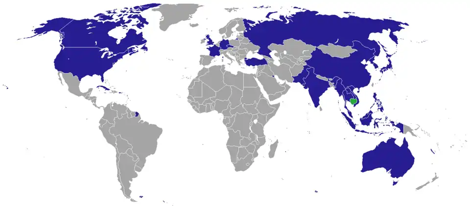 - ^ a b c d e f g h i j k l m n o p q r s t u v w x y z aa ab ac ad ae af ag ah ai aj ak al am an ao ap aq ar as at au av aw ax ay az ba bb bc bd be bf bg bh bi bj bk bl bm bn bo bp bq br bs bt bu bv bw bx by bz ca cb cc cd "Non Resident Missions". Ministry of Foreign Affairs & International Cooperation of Cambodia. Retrieved 11 June 2025.