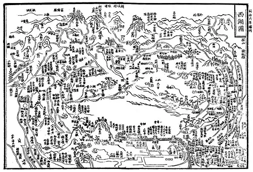 The Map of West Lake from a Qing reprint of Qian Yueyou's c. 1270 Records of Lin'an in the Xianchun Era (Xianchun Lin'an Zhi), showing many of the hills around Hangzhou