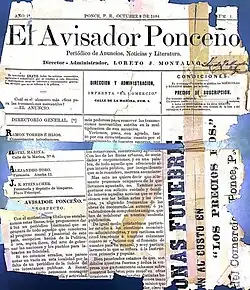 El Avisador Ponceño: periódico de anuncios, noticias y literatura[93] Ponce[146] 1884 (Oct 8)[146][93] Print copies are available at the UPR-JML Library (v.1., n.1. (Oct 1884)).[96] Loreto Montalvo, director.[146]