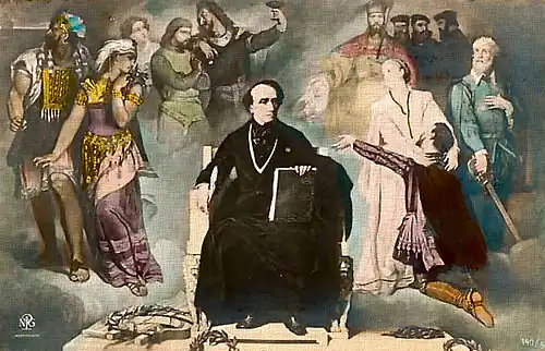 Giacomo Meyerbeer surrounded by characters from his most famous operas. From left to right: Nélusko and Sélika (L'Africaine); Alice, Robert and Bertram (Robert le diable); Fidès, Jean de Leyden and the three anabaptistes (Le prophète); Valentine, Raoul and Marcel (Les Huguenots)