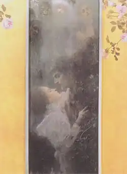 Water Serpents I[68] 1904–1907 Mixed media on parchment, 50 cm x 20 cm Österreichische Galerie Belvedere, Vienna The painting combines various techniques, including watercolour with gold, silver, platinum, and brass on parchment. It was primarily painted in 1904 with minor additions in 1907.[68] The painting is also known as Water Snakes I, Friends and The Hydra.[69][24] The composition showed stretched slender figures typical of the Jugendstil, which displayed an abstract illustration of a long-haired woman embracing a serpent-like figure.