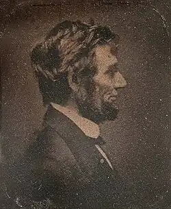 Tintype from lost negative[79] Private collection Taken during the same sitting, this profile reveals the back of Lincoln's head more than perhaps any other portrait.[80]