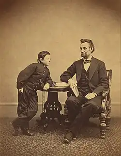 Abraham Lincoln with Willie and Isaac Diller, one of Willie's playmates. Diller recalled about this photo, “I ran across the street from my aunt’s house to get in a free picture with the Lincolns, but I turned my head at the wrong moment to look at a farm wagon. Only the stripes on my socks and my boots showed up.”[49][48]